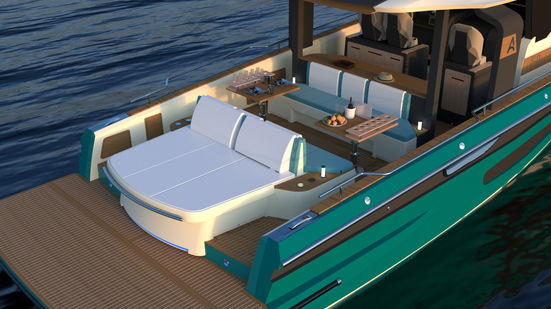Salendo a bordo da poppa si viene accolti da un ampio prendisole, armoniosamente incastonato tra due eleganti passaggi laterali. Questo spazio aperto conduce ad una dinette esterna progettata per accogliere fino a 8 persone con il massimo comfort. Più avanti, occultata dalla seduta prodiera del divano e dai supporti del tetto, si trova una zona bar per offrire occasioni di massima convivialità. A prua si sviluppa un secondo ampio prendisole alle cui pendici è ricavato un divanetto che, contrapposto al divano prodiero, crea una zona living di incomparabile utilità.